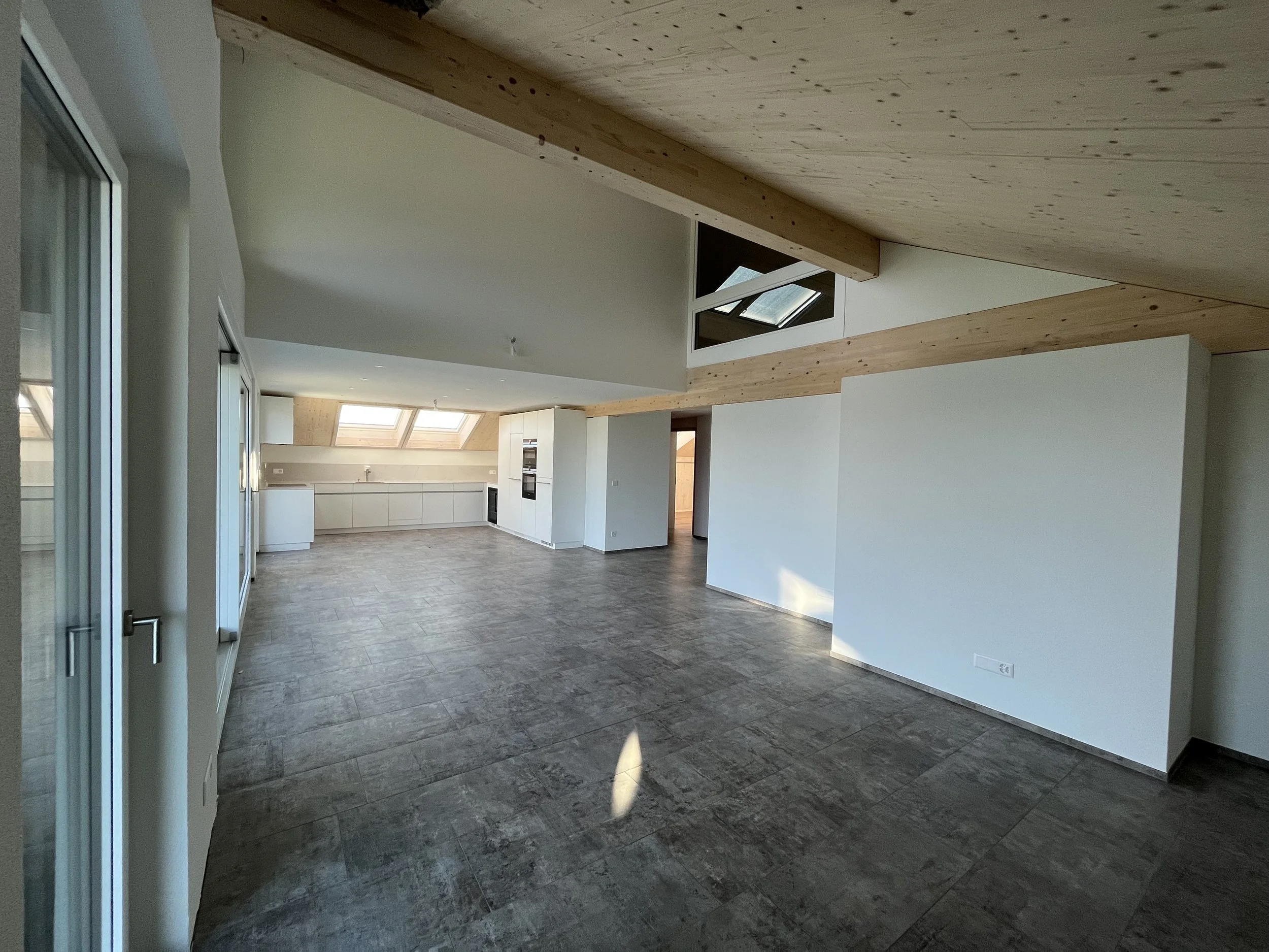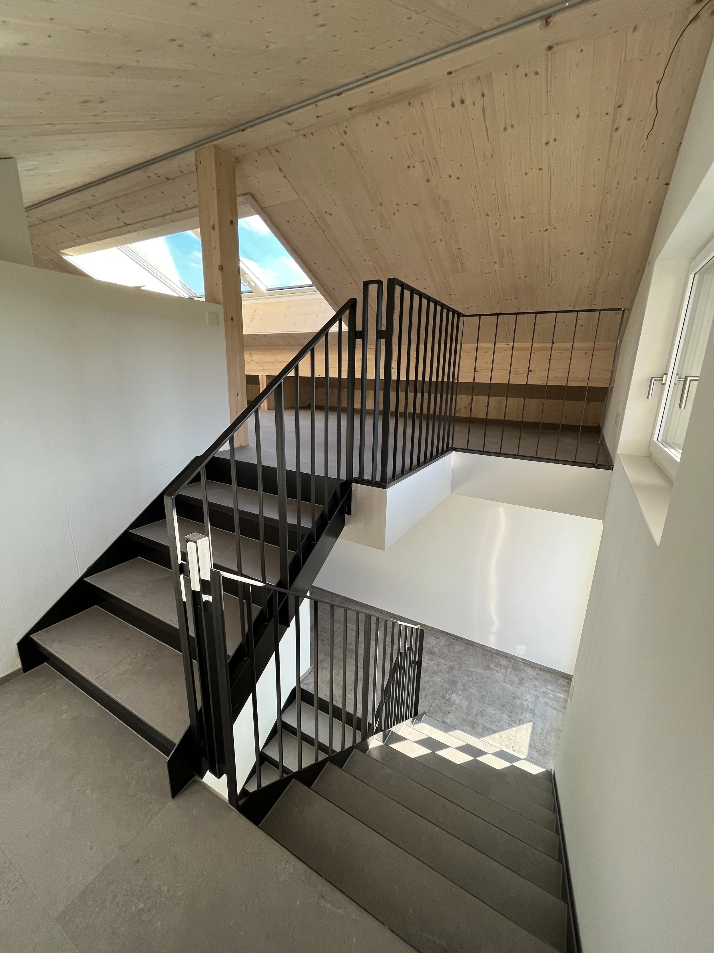 Die Wohnungen zeichnen sich durch helle, offen organisierte Grundrisse mit durchgesteckten Wohnbereichen aus. Sichtbare Holzdecken, ein zurückhaltender Ausbau und viel Tageslicht schaffen eine freundliche, ruhige Wohnatmosphäre. Der zentrale Treppenraum verbindet die Geschosse über eine filigrane Metalltreppe mit klarer Geometrie – funktional und gestalterisch prägnant zugleich.