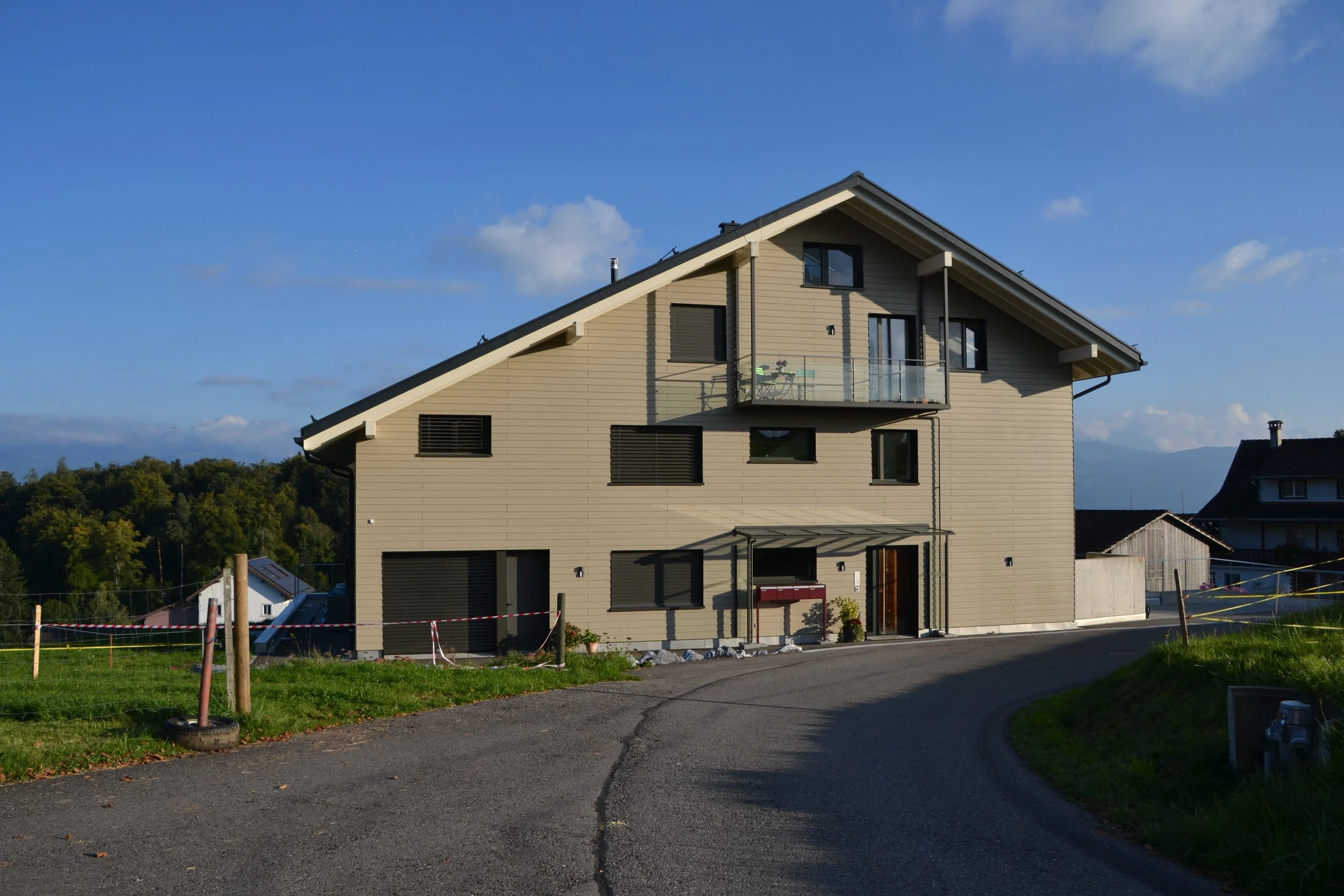 Dieses Mehrfamilienhaus wurde als kompakter, klar strukturierter Neubau mit insgesamt drei Wohneinheiten realisiert. Das Gebäude ersetzt ein bestehendes Wohnhaus und orientiert sich in seiner Massstäblichkeit und Dachform an der umliegenden Bebauung. Die Kombination aus traditioneller Typologie, modernen Materialien und einer zurückhaltenden Farbgebung schafft ein harmonisches Gesamtbild mit zeitgemässer Ausstrahlung.